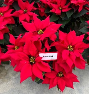 Rapid Red poinsettias from Dümmen Orange were displayed at the Sawaya Gardens Poinsettia Trial in Waterford, Ontario on Nov. 19, 2024.